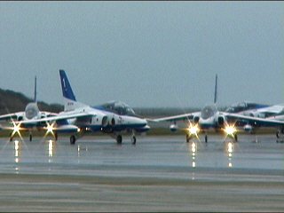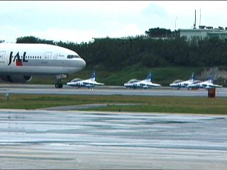 In The Skyに変わり、会場にブルーのナレーションが!!そしてきた!絶え間ない民間機の発着の間をついてブルーインパルス6機がとうとうやってきました!時間は既に3:30!普通の航空祭ならもう終わっている時間です!予定時間は悪天候で飛来できず、それでもあきらめず、この時間になって、来てくれました!土砂降りの飛来予定時間には会場内になんどもブルーの状況が放送されていました。ニュータを離陸できないでいること、予定検討中であること。そして時間も過ぎ、諦めムードが出てきた頃に「新田原基地を離陸し那覇へ向かっている」の放送が!「現在奄美大島付近を飛行中」の放送に感動した!その時も雨は激しかった!そんな中きてくれたんだ!!