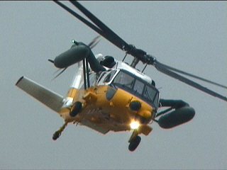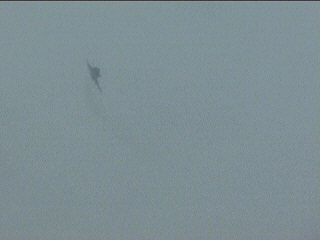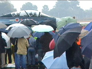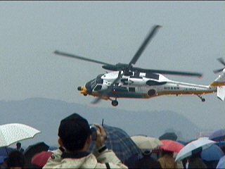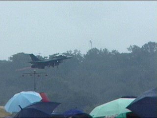 えっらい雨降ってるしなんか暗いし、午後はゼッタイ中止!と思ってたのに気象隊がなんか風船を飛ばしました。お?どんどん行っても見えなくならない風船。おお?場内アナウンスが「第3回目の飛行展示を行います」とかって原稿を読んでます。ウソツキー!と思いました。確かにエンジン音は聞こえるけど、雨天恒例のタキシングかなーと思いました。ところが・・・