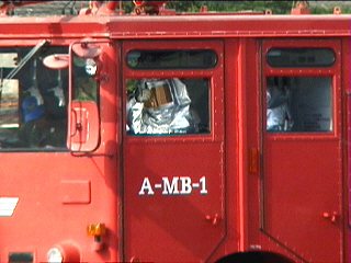 さて、ここからは滑走路上で壊れた飛行機からパイロットを救出、飛行機をつり上げる展示の始まり…ですが…あ、なんか、どこの星の者か分からないひとたちが消防車を乗っ取ったようです!宇宙人、得意げにサムアップです!!