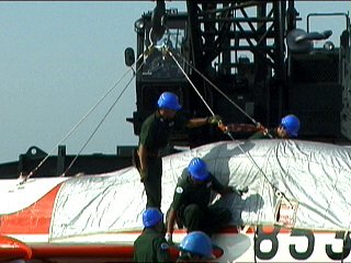 巨大なクレーンでつり上げるために、機体にカバーをします。