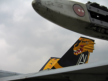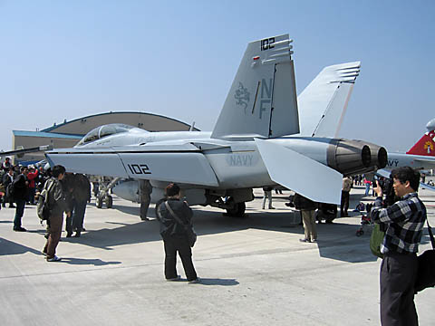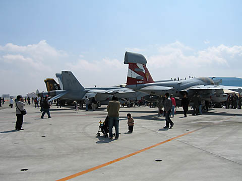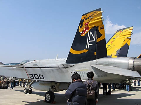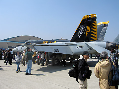 うおっと、VFA-195はコックピットを見せていました!おばぁちゃんと談笑するパイロット、微笑ましいですなあ。列が短かったので並んでみましたが、一人一人がやたらと長いので途中で諦めました。普段できないパイロットさんとの会話を楽しむ気持ちはよ〜く分かりますけど、もちょっと後ろのこと考えようよ。(わがまま)うわ!!VFA-195はこんな写真しか撮ってなかった!