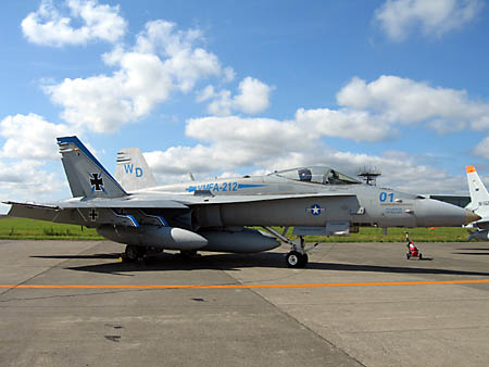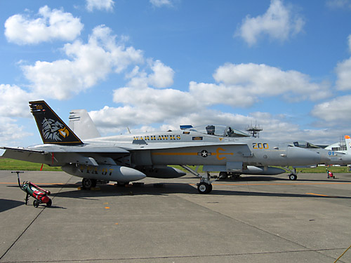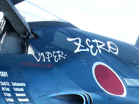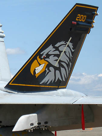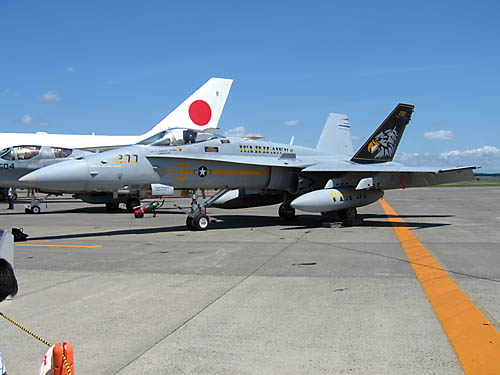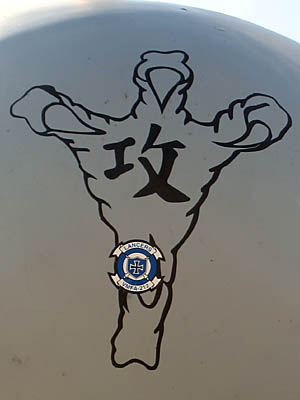 機首にはこんなマークが…。厚木のVAQ-136も「攻」の文字を描いてたことがありました。今も??てか、その下にランサーさんのステッカー貼られてますけど…。ホークさんの18にもこれが貼られてたそうです。んで、午後にはランサーさんにVAQ-130のステッカーが貼られてたとか。なんかお互い非常にバカバカしいことをしているようです。(爆笑)