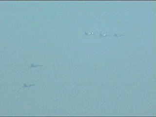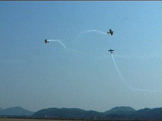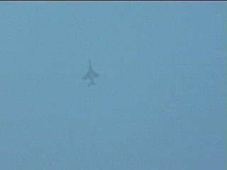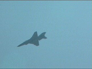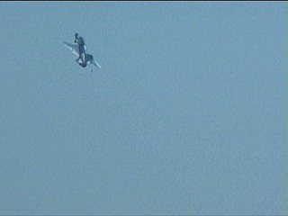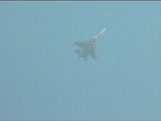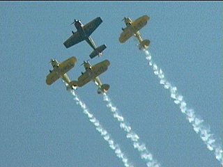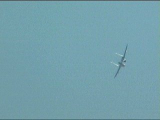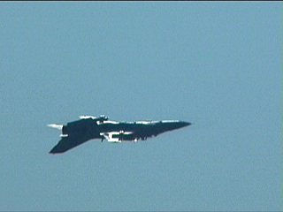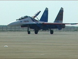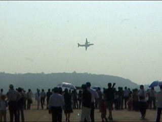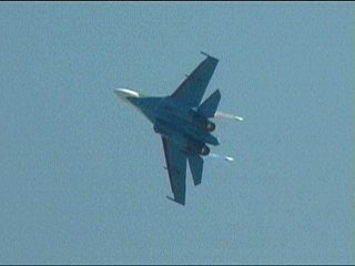 うわ、そうこうしてたらいきなり来た!!今日の注目、ロシア空軍アクロバット飛行チーム・ルスキーイェビチャジ-ロシアンナイツ-です!詳しい説明は次回するとして(手元に資料がない、取りに行くのが面倒;;>安っぽい管理人)、Su-27が動いてる姿は初めて見ました!ちょっと感動!それにしてもでかいなあ。F-15と同じ位置にエアブレーキがあるのね。