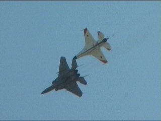 はい、F-15が煽られてます(^^;)パッシングされたりしたら怖いだろうなあ。(笑) クルマでも車間詰められたりしたら怖いですけど、戦闘機じゃシャレになりません。20mm弾を撃ち込まれるかもしれませんし、最悪ミサイルで撃たれます。>撃たれないって、この距離じゃ;←そういう問題か;;