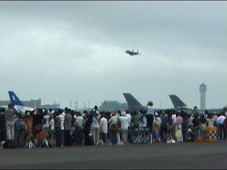 F-16デモチームも滑走路端まで行ってみたモノの残念ながらキャンセル。パイロットが相変わらず手をぐるぐるさせながら帰ってきます。もちろん、マネしてるヤツも発見しました。だいたいみんな間違ってるんだけどね。(笑)