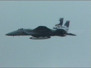 1機目はA/Bに点火してフルパワーで離陸です。もちろんこれ。50周年記念塗装機でした。すごい迫力。近くの人が「すげー!!」って感動してました。本当にF-15が機動する姿を見たらあの二人は気絶するに違いない。