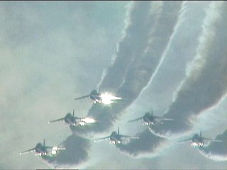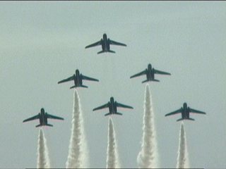 今年のラストはもちろんブルーインパルス!さあ来ました、07年度初見物!珍しい6機でのダーティローパスで登場です!って、これを見るたびに「珍しい」って書いてますけど、過去のレポを見直すとちょくちょくやってるみたいですね。(^^;)