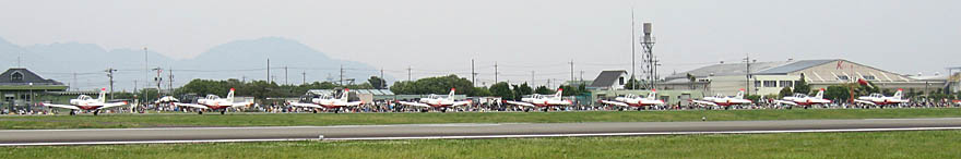 出ました紅白饅頭。今年の地上展示T-4は浜松の赤。赤尾翼にチェッカーかあ。借り物じゃなく正式に浜松に配備されてるって事ですか。いつの間にか見慣れましたが、やっぱりちょっと特殊でかわいい色ですね。2003年9月〜2004年6月に芦屋の13TFWが浜松と松島に移動訓練していた時期、浜松航空祭で編隊飛行したことがありましたっけ。