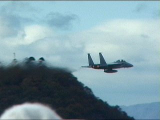 と思ったら、同時にF-15もやってた!!ほらほらー!“同じ課目で比較”どころか、視界の中で同時に旋回を開始して性能比較を見せてくれるなんて、他ではゼッタイに見られません!両機の旋回性の差が凄く分かりやすかったです。F-2の方が若干早く回ってきました。軽快なF-2、重厚なF-15って感じかな。