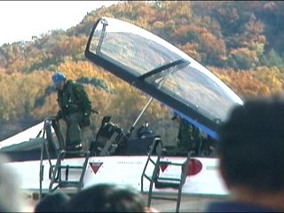 紅葉が綺麗だなあ。高射隊の山が紅葉していました。プログラムではオープニングには登場しないはずだったF-4が天候偵察に離陸です。