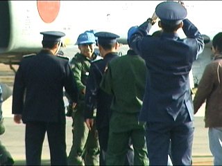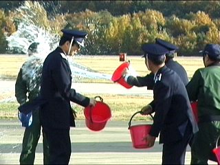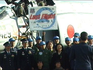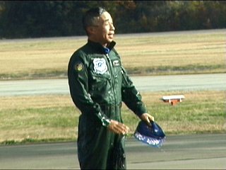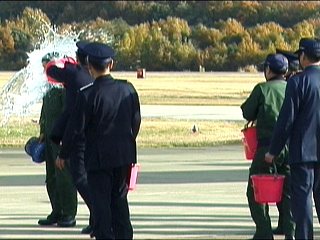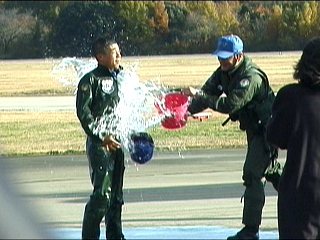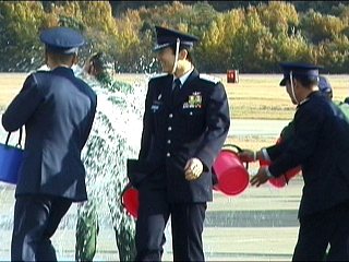 池田一佐さんの自衛隊パイロット生活最後の 瞬間は、飛実団みんなの祝福を込めた盛大な バケツシャワーでした。 嬉しそうに駆け寄る同僚パイロットの皆さん、 |