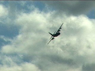 お、C-130登場!?例年は編隊の間に戦闘機が機動を行いましたが、今年はC-130が間を埋めるようです!ところでコイツはメタボだと思います。
