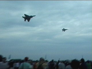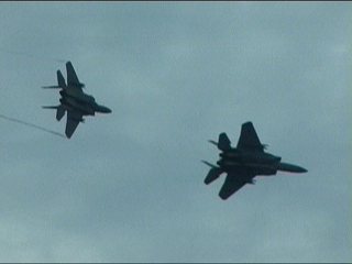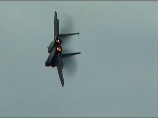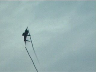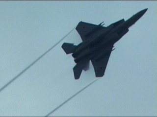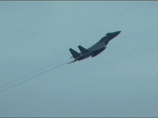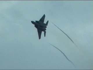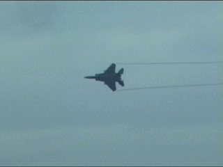 | はい、また復習です。エンジェルウィングってのは、米空軍F-15デモチームがそう名付けていた、 この主翼上に出るベイパーのことです。どうですか、天使の翼が生えてるように見えませんか? エレメンドルフでF-15デモチームが見せたこのエンジェルウィングがいちばん綺麗でしたね♪→ これを青空バックで見れたら綺麗だろうなあ〜。 日本だとこの小松で比較的よく大規模なベイパーが見られます。 いつか、晴天下のこれの写真を撮られた方がいらっしゃいましたら、ぜひ見せてください♪ |