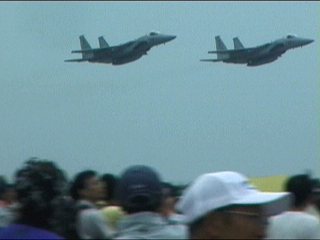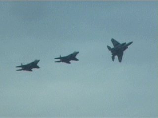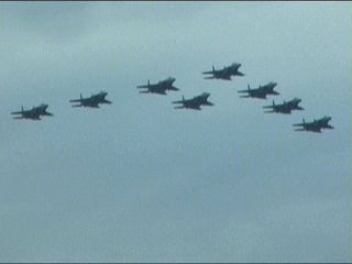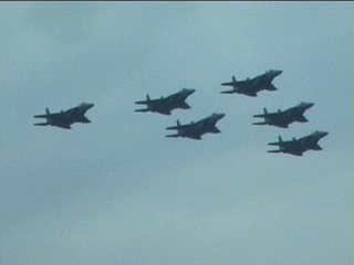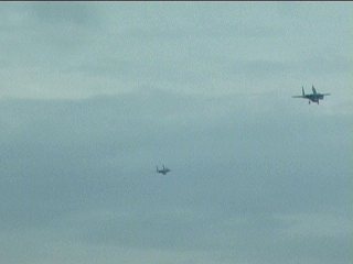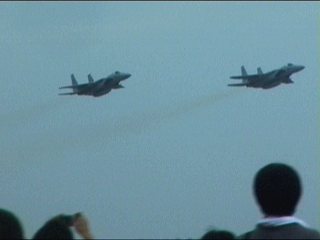 せんとりー・・・じゃなくて、これもよーくみてください、6機のF-15がいます。この画像ではほとんど分かりませんけど、前にクリーンの3機、後ろに脚だしの3機がそれぞれ間隔の広いアブレスト隊形でならんでいます。これは初めて見た!かっこいい!