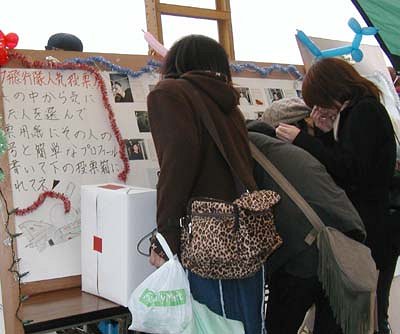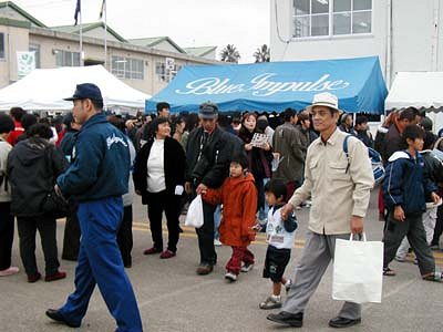 ![]() ご存じ、ブルーインパルスのブースです。毎回大人気の人だかり。 |
