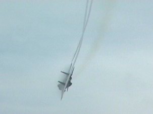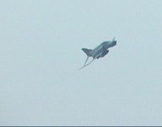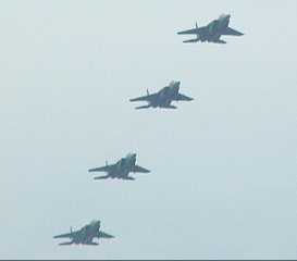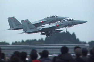 ![]() またまた飛行展示に向かうF-4×4。幾分天気が回復し、機動飛行の 予定で離陸しました。今年は、301Sqと23Sqの機動飛行を同時に行う という贅沢なプログラムでした。 |