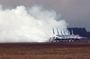 飛べない時でもエンジンランナップにエシュロンタクシー、精一杯見せてくれます。以前は、1機ずつスモークを引くながらの模擬離陸を見せていたこともありましたが、その時々によるようですね。