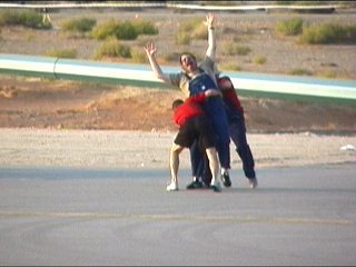 最後にやっと着陸成功。スタッフが駆け寄ります。