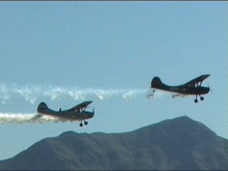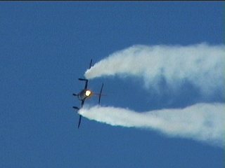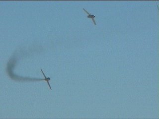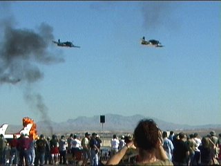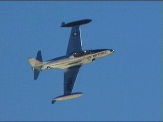 ほら始まった、世界初のジェット機どうしの空中戦。追いつ追われつ、なかなかの迫力のデモを魅せてくれました。