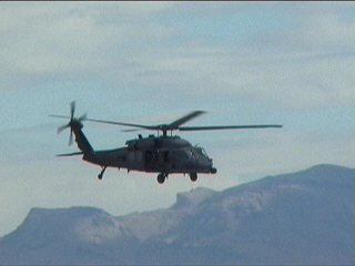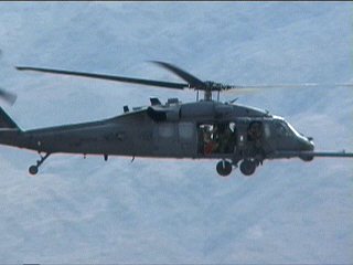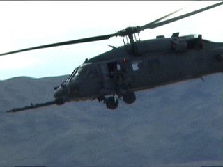 そして遭難者(パイロット)を救出に向かいます。目標上空に到達する前から低空で救難員が降下を開始、目標にぴたりと合った時にはすでに救難員は地上に到達しています。救助対象者を一瞬で回収し、すぐに離脱!まさに戦場でパイロットを助け出すコンバットレスキューです。