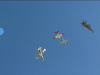 この後、エアショーへようこそのセレモニーがありました。昨日につづき歌の演奏、そして、本日はブッシュ大統領からのメッセージがありました!みなさん、アメリカ万歳を再認識していました。(^-^;)