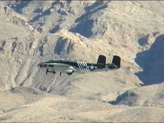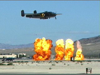 空から降ってきた屈強な男達の上をB-25が突っ切ります!