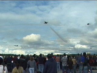 お、エシュロンロール!これを見ればもう次ぎに何が来るか分かるの。しかもバーズよりもタイミングが遅いからぜんぜんビックリしないの。だけど編隊はいつまでもスモークを止めずに飛んでるもんだから見事に皆さんそちらに釣られます。(笑)