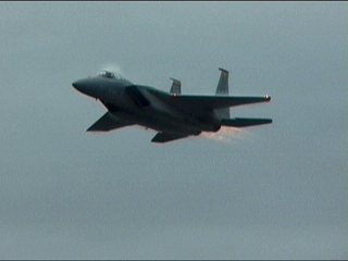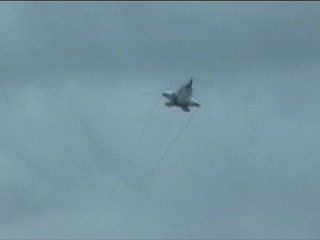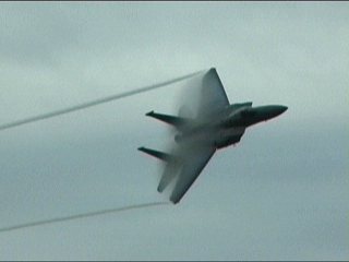 続いてF-15デモチームスタートです!これ、機体の背中側はすごいベイパーが出てるんでしょうね。なんか白いマント背負ってるみたいです。(笑)確かにヨーロッパで他機種と比べて見ちゃうとちょっとアレでしたけど、んもう、ここで見たらそんなの言いっこなしです!スピードが1番!パワー最強!これぞ戦闘機!!でしょう!だってヨーロッパさん達のは戦闘機のデモって言うには抵抗があるもん。ありゃ見せ物ですよ、見せ物。おもしろいけど。>要するにどっちも好き(^^;)