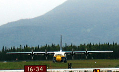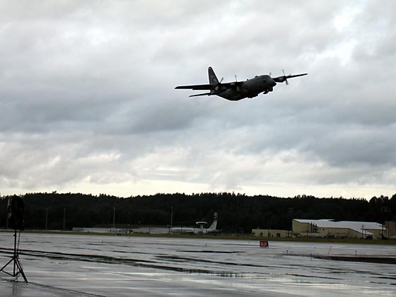 C-130が離陸します。バックは針葉樹の森です。寒い地方なんですね。
