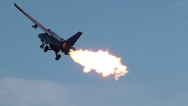 F-111といえばこれ!鴨とアヒルのコインロッカー!じゃなくて、ダンプ&バーンです!投棄した燃料にアフターバーナーで点火、長い炎を曳きます。寸ごい迫力です。目の前を通過すると熱が来るもんね。日本でやったら「低空で火を噴いていたが大丈夫か!」と地元警察に通報があることでしょう。
