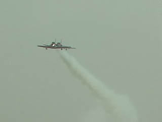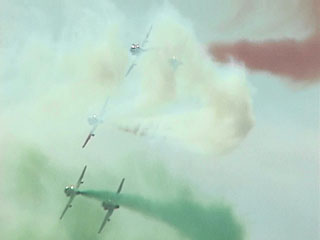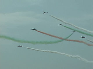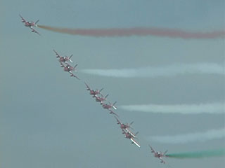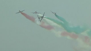 なんかたくさん飛んでる。。。シルエットだけ見るとフレッチェトリコローリに似てるかも。スモークの色も。オレンジですけどね。海外のカラースモークを使ってるチームって、やっぱりかつてのブルーと一緒で顔料を混ぜてるんでしょうか。