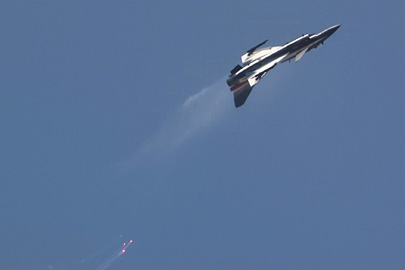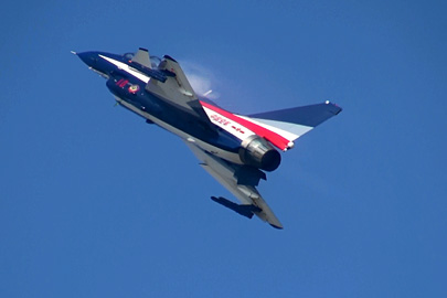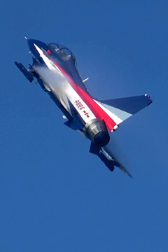 さらに機種を上げ、すんごい角度で離陸します。70度以上ですか?乗ってる人にとってはほとんど垂直に感じるでしょうね!それにしても2年前に見たJ-10とはずいぶん印象が違います。塗装でこんなに変わるものなのですね。