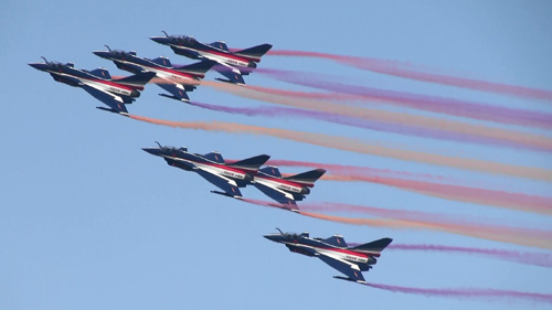 お!すごい、こんな風に見えるんだ!八一飛行表演隊のJ-10の編隊離陸!けっこう密集してますね!