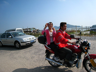 飛行場をぐるっと回って。そうそう、飛行場のすぐ向こうは海ですよ〜。ちょうどバイクのお姐さんとカメラ対決になっちゃったわ。