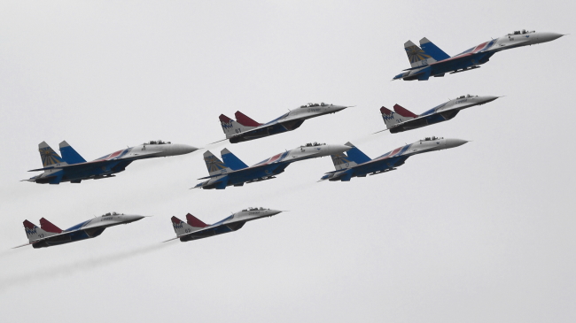 いつの間にか曇っちゃった。ロシアコンビ、ロシアンナイツとストリジィです。混成編隊はMAKSで比較的よく見られますが、国外で展示したのは初めてとのことです。