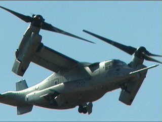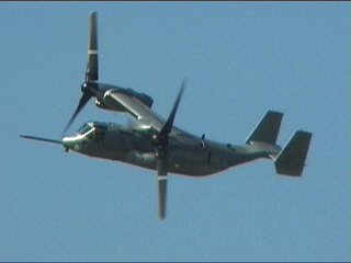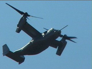 でました、MV-22オスプレイ!ご存知のとおり、プロペラを垂直にすると地面にぶち当たりますので地上では斜めにしてます。