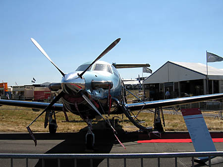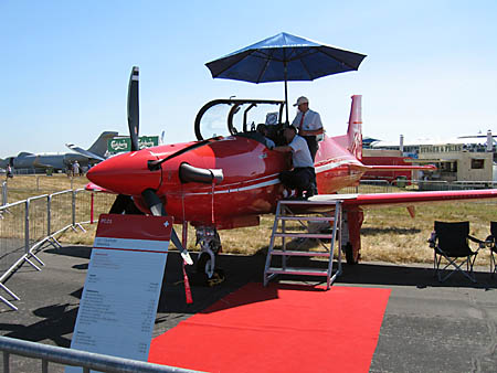 これ知ってる。PC-9だよね。(^^)(注:PC-21でした… ビジネスです。傘までさしちゃって、シャツにネクタイのおっさんがコクピットに座ってます。