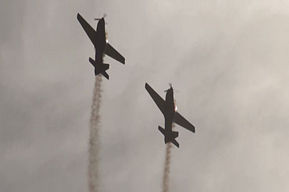 エスカドリラ・ダ・フマサは7機編成です。アルコネスのエクストラ300Lに見守られ、離陸します。