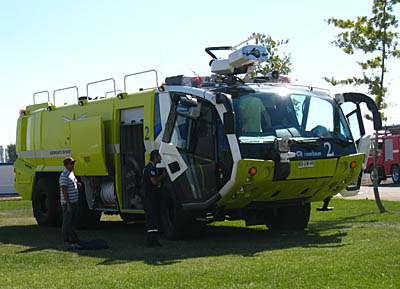 さて、とりあえず今日は撤収しましょう。なんか、消防車がいました。黄色いなあ。でもいろんな国で、飛行場ではこのタイプの消防車をよく見かけますよね。お値段が高そうです。