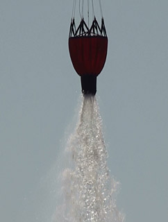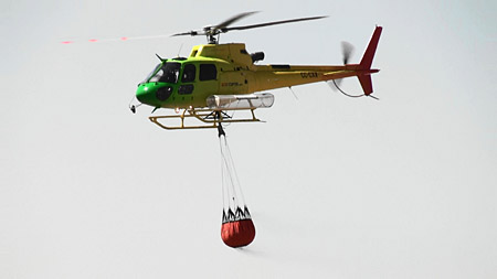 さて、それはそれ、これはこれ。可愛い色のヘリコプターが来ました。バケツを持っていますね、水をまくのでしょう。脇のかごは救助した人を入れて吊り上げるのかな??
