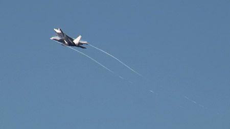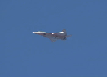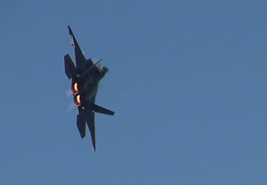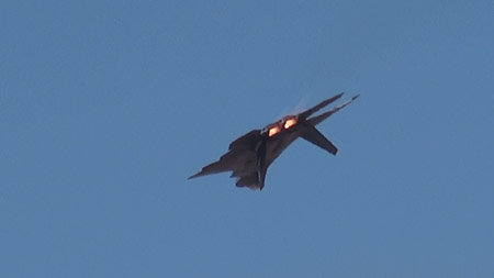 ほぼ目の前で急上昇。なぜかその場でストップ。。。。どうなってんだか。フランカーやオーストラリアのF/A-18が見せるテールスライド時のストップ(上昇力スピードがゼロになった瞬間)とは明らかに違い、この体制で数秒間ストップして見せます。かなりのエンジンパワーで吊ってるんでしょうね。