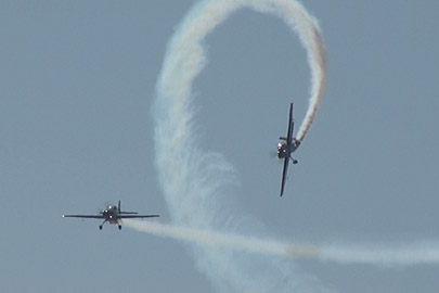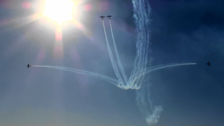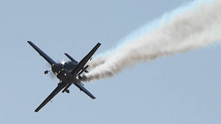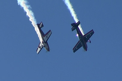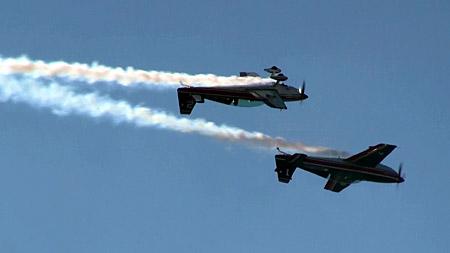 単機で技を競う競技機での編隊アクロとなると、実施する科目もまったく別物を準備する必要があることでしょう。単機だと機体の向きもよくわかんないようなすさまじいロールをしたりしますけど、そんなことしながらのクロスとかはありえないですもんね。むしろ、この手の機体にしてみれば物足りないぐらいの動きのロールでクロスした方が、コンビネーションとしては見栄えが良いはずです。