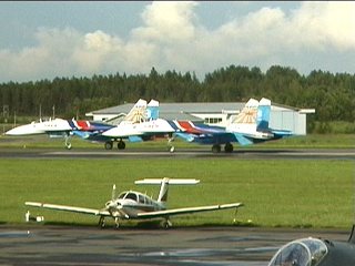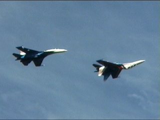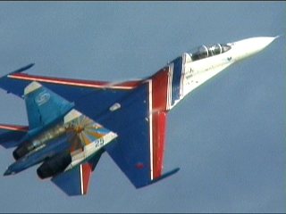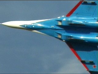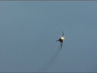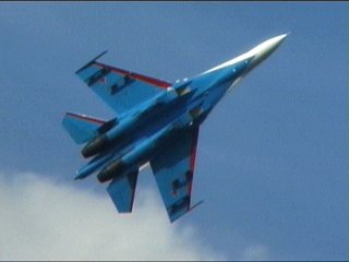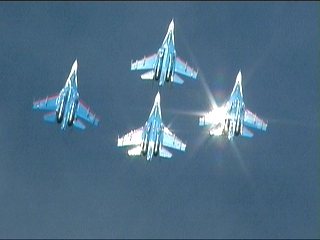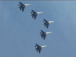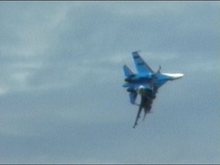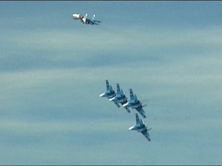 ロシアンナイツのフライトは5機で始まり、途中でどんどん脱落し、最終的に1機まで減ります。脱落したやつはさっさと着陸します。アクロフライトの解説でよく聞く「お互いを信頼し」が、このチームに関してはまったく説得力ありません。なワケないか。(笑)