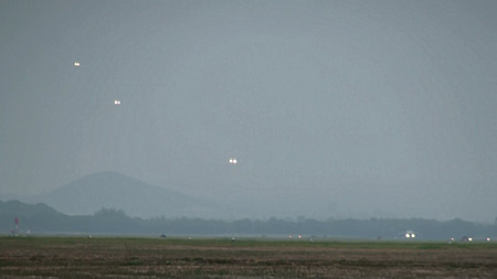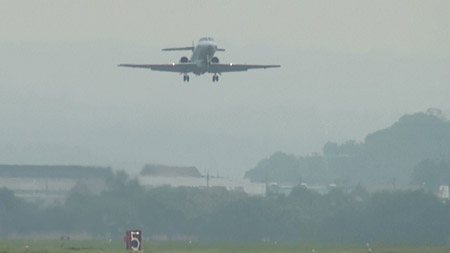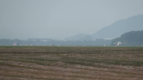 滑走路に順次着陸します。後方に見えているのは尾張富士と呼ばれる、犬山の山です。