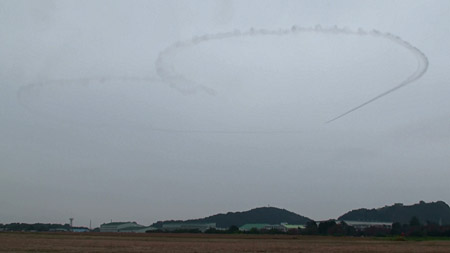 予行で見たときは見事に隊形変換とカンチガイ。いやいや、会場より東、犬山市から見たときも、なんか散らばっててまとまりのない編隊が基地に向けて間隔を詰めていったように見えたんだけど、、、