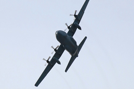 次も小牧部隊です、これは地上展示に来ていたC-130が飛びました。ぐるぐるっと急旋回をみせたり、これも豪華な機動飛行です。