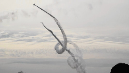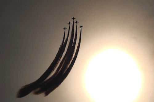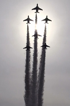 快晴でも逆光ですが、薄曇で不思議な空の中、ブルーインパルスが飛翔します。