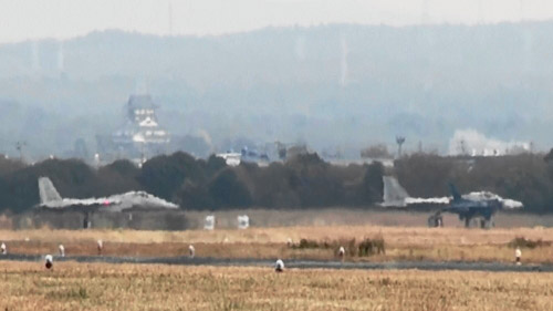 おー。F-15のバックに。なんと。犬山城が見えている。昨年、もっと曇りの中で薄ぼんやり見えていたお城、今回しっかり確認しましたあ☆