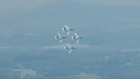 6年前の空自50周年の年に生まれたこのさくら、横から見るとこんな風に何機ものブルーが同時に旋回してるのが見えるんですね!下から見る優雅で美しいさくらも、ここから見ると迫力があるなあ。