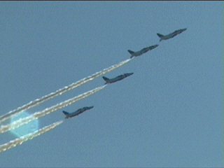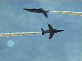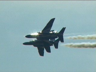 2機が広く間隔を取って進入、お互い向かい合うように旋回し、目の前でクロス、さらに旋回を続けもう一度クロした後、再び北に向かってブレイクします。怒濤の戦闘機3種の連続クロスターンは鼻血ものです!地元で良かった!出血多量になっても帰れるもんね!(^-^;